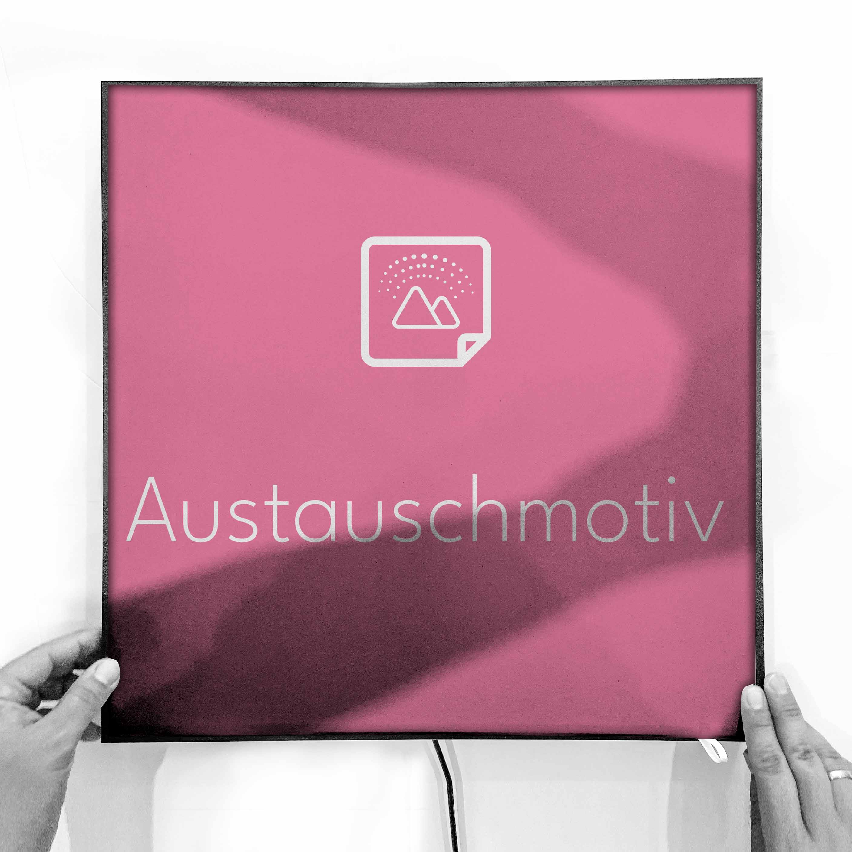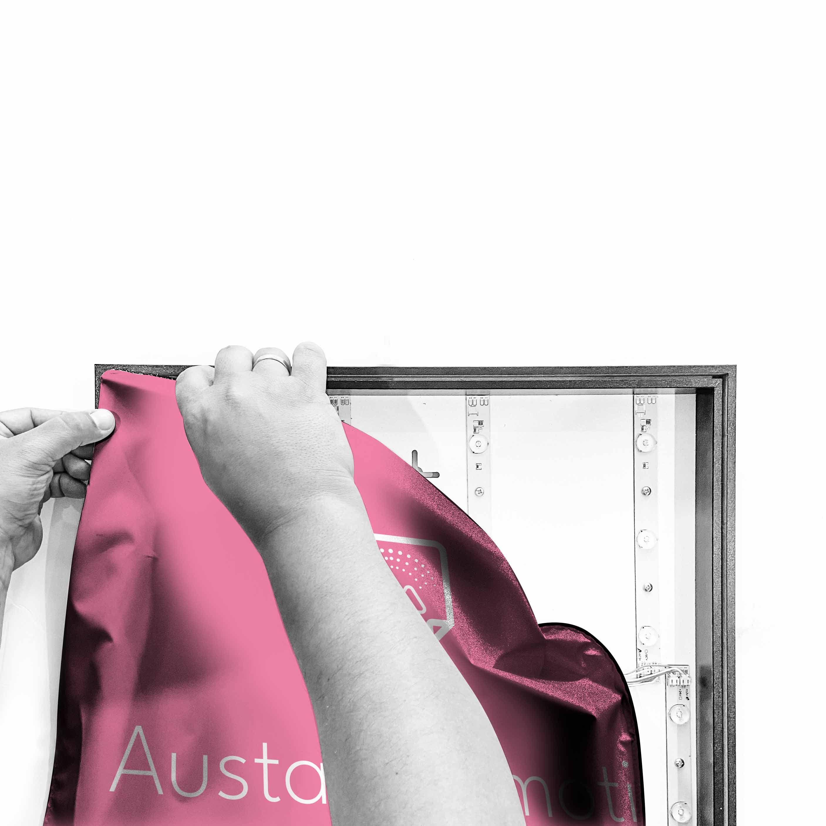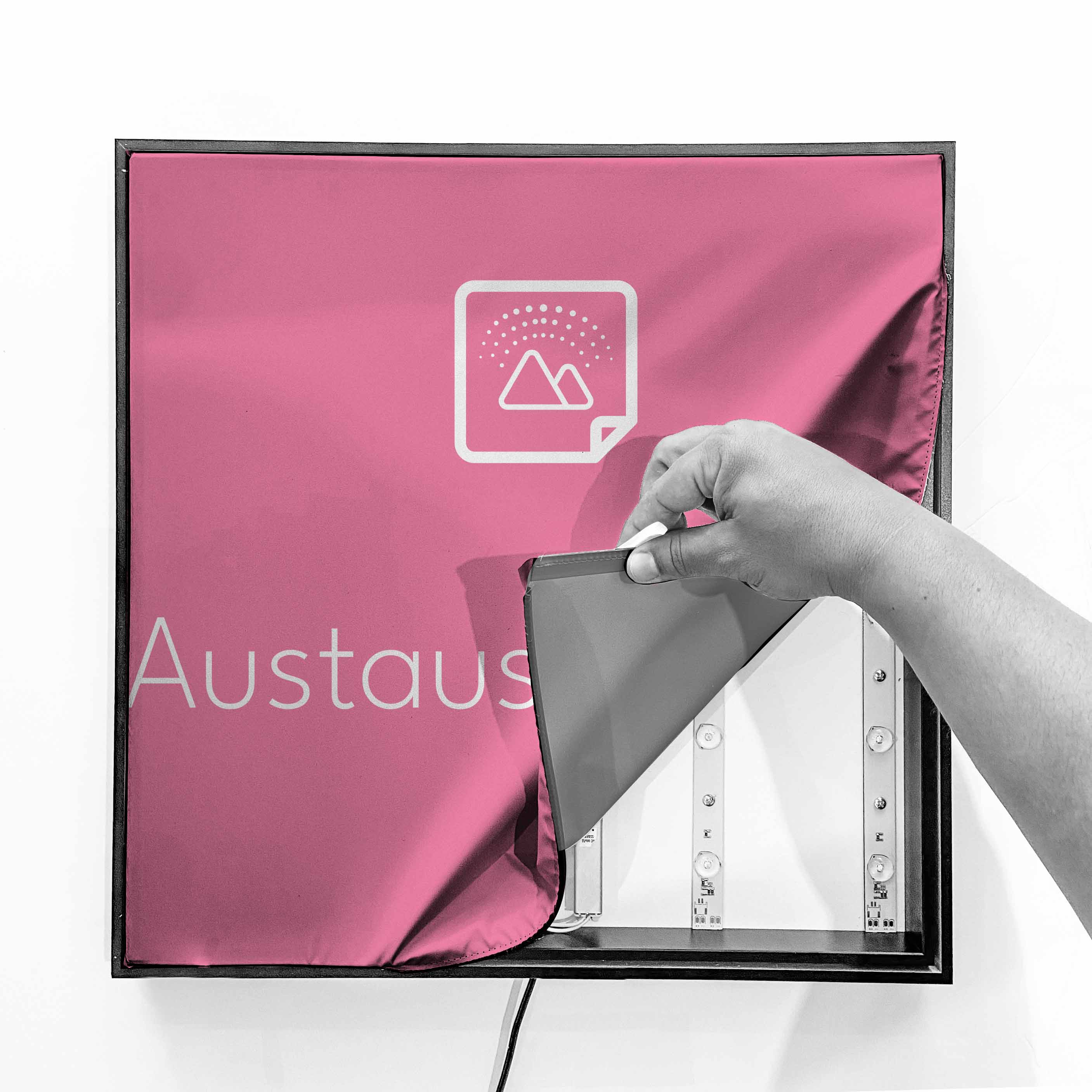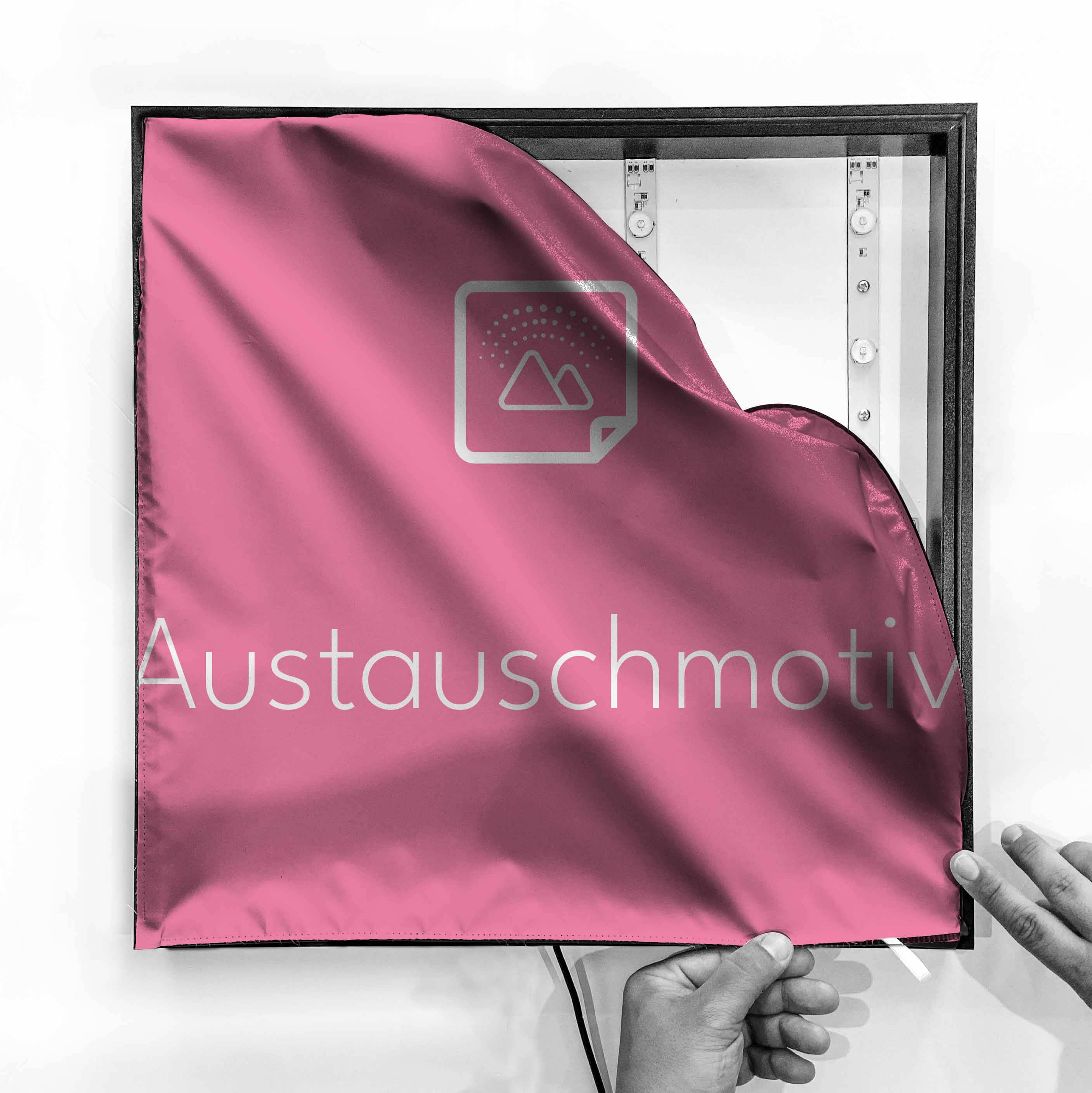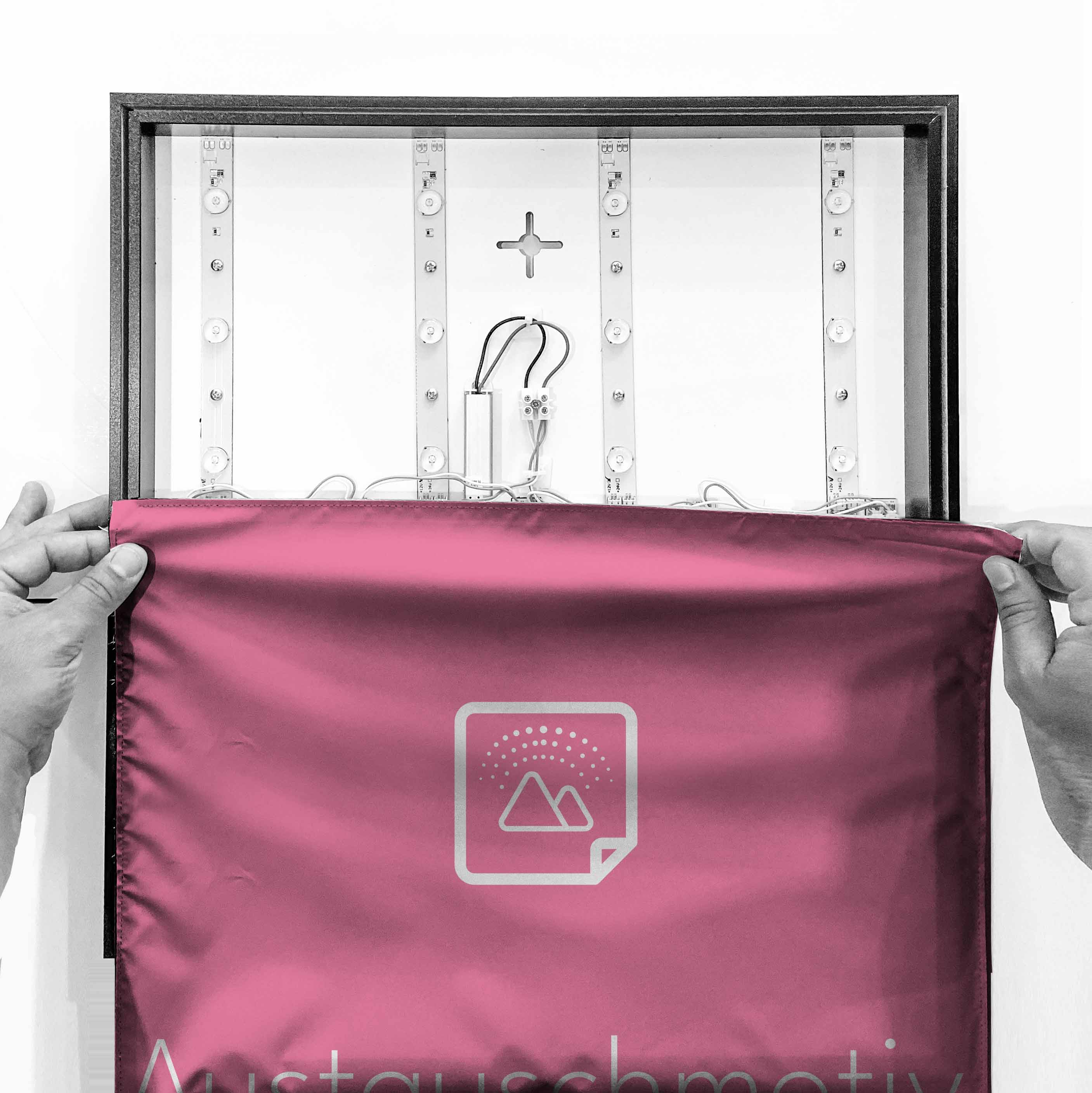 Der LED-Rahmen ist geöffnet und bereit für das Einspannen des Motivs. Achte darauf, dass das Motiv mit der bedruckten Seite nach außen zeigt und die Silikonkeder frei zugänglich ist.
